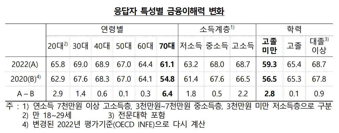 그러나 디지털 금융이해력 점수는 42.9점으로일반 금융이해력 점수(66.5점)를 크게 하회하며 전반적으로 낮은 수준을 보였으며 특히, 70대 고령층(36.0점), 저소득층(39.4점) 및 고졸 미만(35.9점) 등의디지털 금융이해도가 낮은 것으로 조사되었습니다.