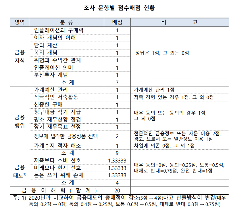 우리나라 성인(만18~79세)의 금융이해력 점수는 66.5점으로 조사부문별로는 금융지식이 75.5점으로 가장 높은 가운데 금융행위65.8점, 금융태도 52.4점 순으로 나타났습니다.