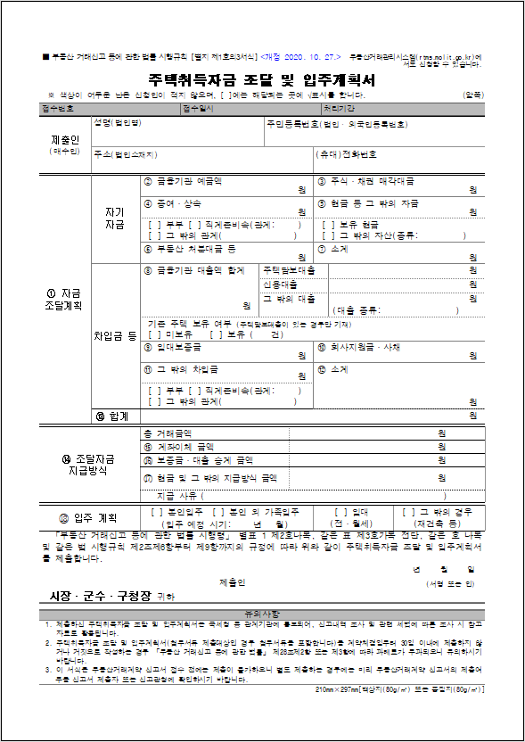 주택법 시행규칙에  의하여 주택 매수자가 주택자금조달을 어떻게 할 것인지에 대한 계획을 작성하여 제출하는 데 개인 또는 법인이 특정지역 또는 특정금액 이상의 경우 작성하게 됩니다.