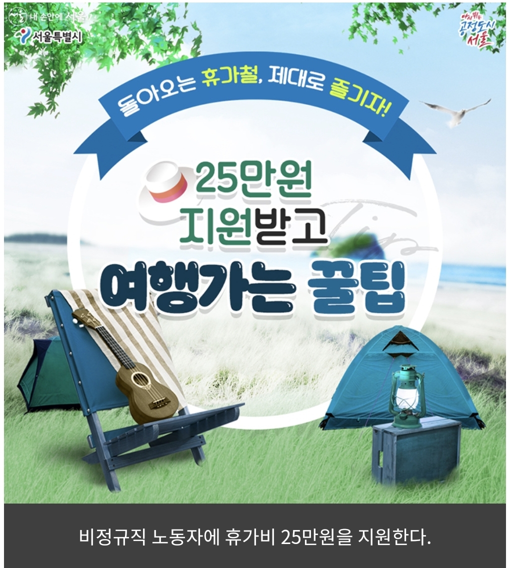 비정규직 노동자 등에게 휴가비를 지원하는 ‘서울형 여행바우처’ 지원 사업 참여자 1,300명을 모집한다. 대상은 연소득금액이 3,600만원 미만(월평균 300만원 미만)인 서울 거주 비정규직 노동자이다.
