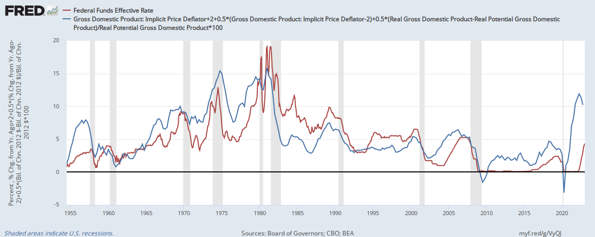 기준금리 = 인플레이션율 + 균형실질금리 + 0.5×(실제 인플레이션율–목표 인플레이션율) + 0.5×(실제성장률-잠재성장률)