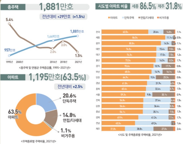 통계청에서 발표한 "2021년 인구주택 총조사 결과"에 따르면 전체주택 중 공동주택이 78.3%를 차지하고 이중 아파트의 비중이 81%라고 한다.