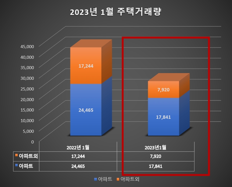 국토교통부가 발표한 2023년 1월 주택 통계자료에 따르면 2023년 1월 전국 주택 매매 거래량은 총 25,761건으로 전년 동월 (2022년 1월 : 41,709건) 대비 38.2% 감소한 것으로 나타났다.