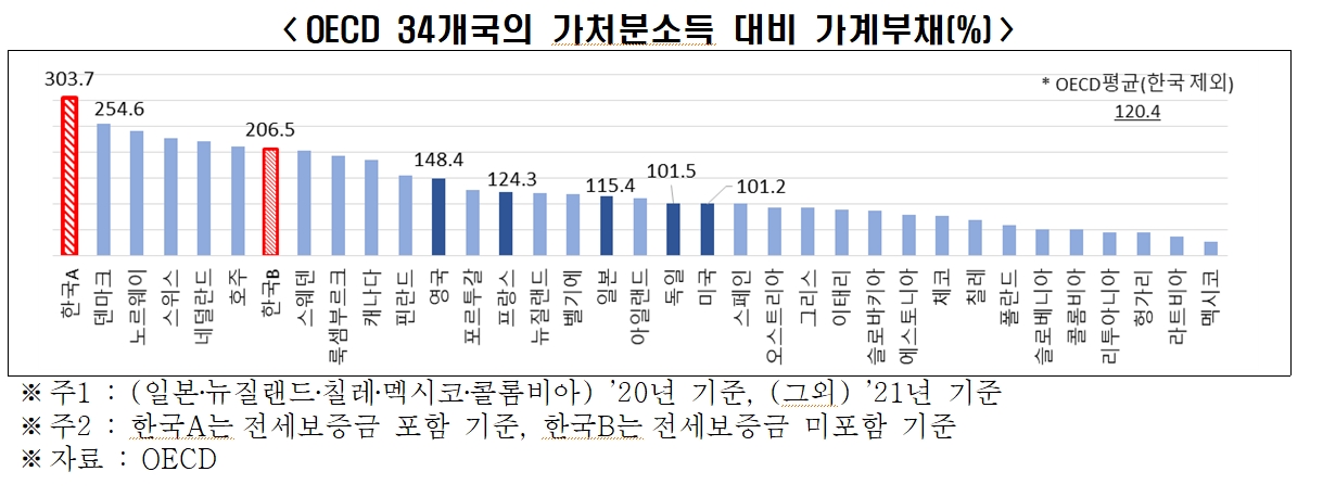 또한,  전세보증금을 포함시킬 경우 가처분소득 대비 가계부채 비율은 303.7% 로 역시 압도적 1위로 등극하게 된다.