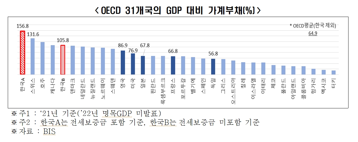 기존 방식으로 가계부채를 집계해도 대한민국은 OECD 31개국 중 4위로 위험한 수준이었지만 전세보증금을 포함시킬 경우 압도적인 1위로 등극하게 된다.