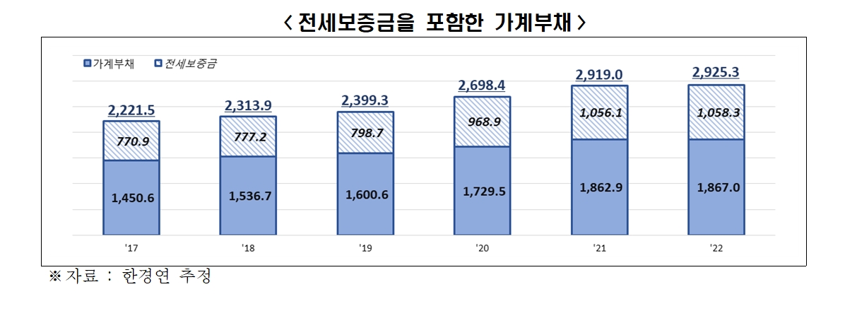 전세와 반전세는 대한민국에만 있는 제도로서, 전세보증금은 임대인의 부채이지만 국제통계에는 집계되지 않는 것이 일반적이었다. 우리나라의 특징을 고려하여 전세, 반전세의 보증금을 모두 포함시키면 2022년 기존 2,925조 원으로 3천조 원을 눈앞에 두고 있다.