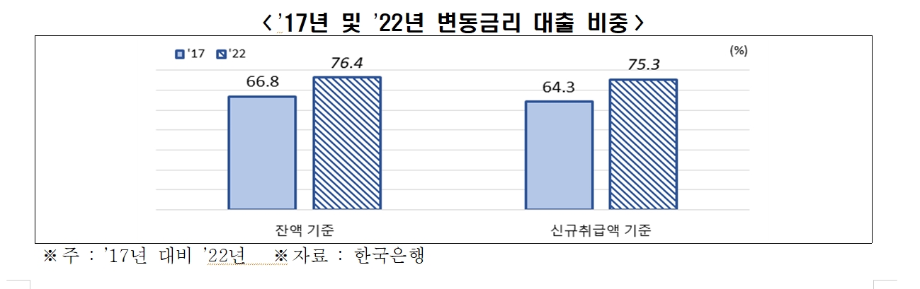 대한민국 가계부채의 변동금리 대출 비중의 2022년 잔액기준 76.4% 로서 미국금리 수준으로 인상될 경우 대규모 혼란이 발생할 가능성이 높다.