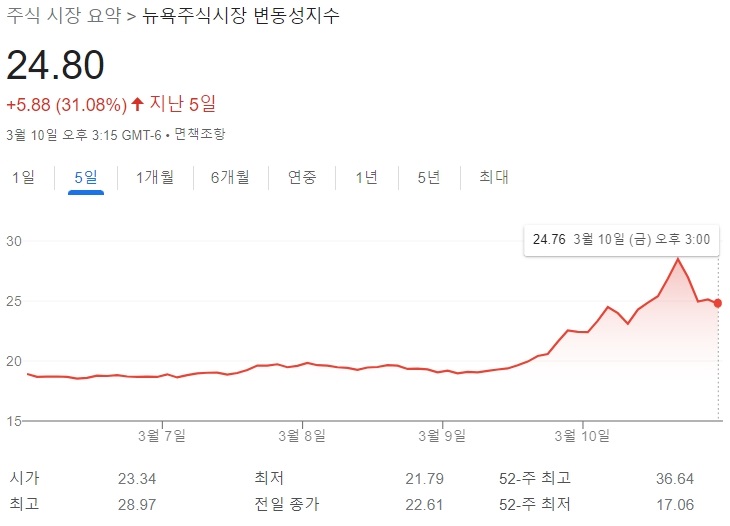 SVB폐쇄 영향으로 뉴욕주식시장 변동성지수가 대폭 상승을 기록했다.