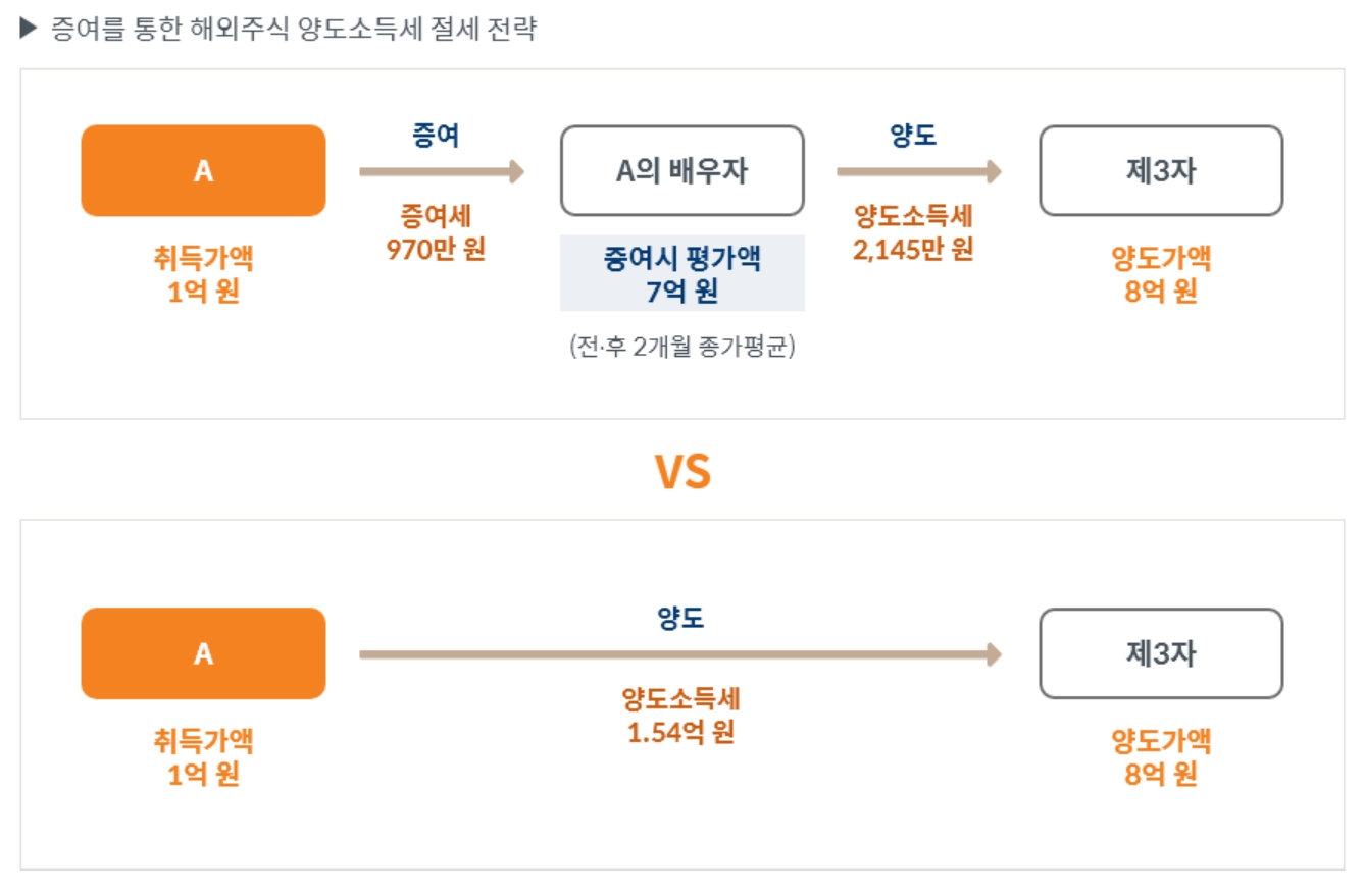 한편, 보유하고 있는 해외주식을 처분할 때 증여를 한 단계 거치면서 세금을 줄일 수 있는 절세 방법도 유효하다.