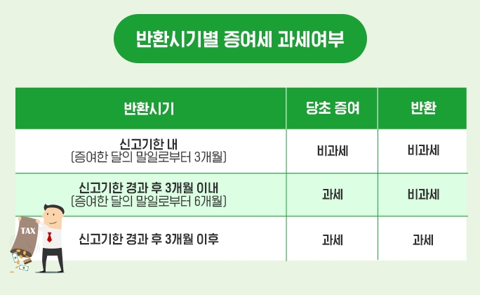 마지막으로 신고기한 경과후 3개월(증여한 달의 말일로부터 6개월) 이 지났다면 첫 번째 증여도 증여세를 내야 하고 반환할 때도 증여세를 내야 한다.