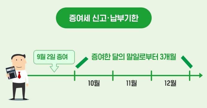 증여세 신고·납부 기한은 증여한 달의 말일로부터 3개월이며 증여 받는 사람의 주소지를 관할하는 세무서에 증여세 신고서를 제출하는 것이 원칙이다.